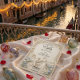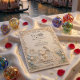 Capture the timeless elegance of a fairytale union with this heritage-style design, featuring a romantic garden scene in a soft, monochromatic ivory palette.This design draws inspiration from the grandeur of early 20th-century craftsmanship, presenting a sophisticated visual narrative. The background simulates a sculpted limestone surface, creating a high-fidelity visual texture of bas-relief masonry. Central to the composition is a classically rendered scene of a groom kneeling before a bride within a formal architectural gazebo, surrounded by a cobblestone path. The imagery is framed by quintessential Art Nouveau biological curves, featuring swirling vines and delicate pastel blue tulips that break the monochrome ivory and cream spectrum. The typography hierarchy balances formal serif headers with elegant calligraphy script for names, ensuring legibility against the textured backdrop.This is a flat printed image with a faux carved stone effect, not actual raised material or deep embossing.