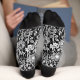 Socks in an Art Nouveau pattern based on a vintage William Morris floral damask wallpaper pattern, digitally enhanced and colored in white on a black background