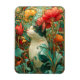 Eine majestätische Katze mit üppigen, detailreichen Fellen liegt anmutig inmitten einer verzierten Anordnung von Blume und wirbelnden Weinreben, die alle in einem aufwändigen Jugendstil-Design gerahmt sind. Die Katze blickt mit einer ruhigen Weisheit nach oben, gebadet in sanftem goldem Licht, während der Hintergrund blüht mit reichen Pastellfarben und Erdtönen und schafft ein Gefühl zeitloser Schönheit und natürlicher Eleganz.