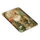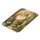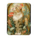 Eine majestätische Katze mit üppigen, detailreichen Fellen liegt anmutig inmitten einer verzierten Anordnung von Blume und wirbelnden Weinreben, die alle in einem aufwändigen Jugendstil-Design gerahmt sind. Die Katze blickt mit einer ruhigen Weisheit nach oben, gebadet in sanftem goldem Licht, während der Hintergrund blüht mit reichen Pastellfarben und Erdtönen und schafft ein Gefühl zeitloser Schönheit und natürlicher Eleganz.