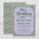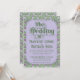 An elaborately detailed Art Nouveau wedding invitation featuring a pattern of lilac lovebirds and lavender butterflies in profile perched atop scrolling vines of purple thistle on a light green and cream dotted background. A pairing of elegant fonts has been carefully selected to accompany this invitation's decorative floral announcement text, however, they can be changed to meet your needs. You can also change their colors, as well as the color of the announcement text.