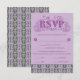 Ein aufwendig detailliertes Art Nouveau-Design mit einem lila Distel-Rollmuster und einem gestreiften Rebenmuster auf lila Hintergrund. Eine Kombination aus eleganten Schriften wurde sorgfältig ausgewählt, um den dekorativen Blumenschriftzug dieser Einladung zu begleiten, sie können jedoch an Ihre Bedürfnisse angepasst werden. Sie können auch ihre Farben sowie die Farbe des RSVP-Textes ändern.