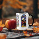 Eine rote Haarbatterine mit Kessel, Kerze, Kürbissen, Vollmond und einem Satin-Glas-Schmetterling