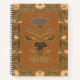 Dieses Notizbuch zeichnet sich durch ein im Jugendstil inspiriertes Blumendesign aus. Der Hintergrund ist braun, lederähnlich, gerahmt mit einem verzierten Rahmen aus Weinreben, Blätter und blassgelben Blumen, die mit goldenen Details versehen sind. Im Mittelpunkt steht eine stilisierte Blume mit goldenen Konturen, die sich durch elegante, kurbelnde Stiele und weitere kleinere Blüten ausdehnt. Die Ästhetik ist Vintag und dekorativ und erinnert an klassische Buchbinderdesigns aus dem späten 19. und frühen 20. Jahrhundert.