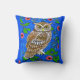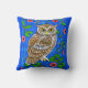 Kissen in einer Art Nouveau inspirierte Abbildung einer braunen und cremefarbenen Eule auf einem kobaltblauen und korallenorangen blumigen Hintergrund