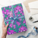 Papier in einem William-Morris-Textil aus Reisen und Blätter, digital verstärkt und farbig, in sanfter Orchidee und Türkis, auf einem tiefgründigen, amethystischen lila Hintergrund