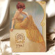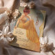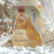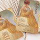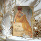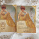 Tauchen Sie ein in den Vintagen Charme dieser eleganten, im Jugendstil inspirierten Speisekarte. Dieses Design, das eine anmutige Frau in einem fließend gelb gestreiften Gewand, Set in einem sanften, goldenen Hintergrund mit aufwändigen Wirbel verziert, strahlt Eleganz und Wärme aus. Der Text ist wunderschön gestylt, um das Kunstwerk zu ergänzen und enthält ein köstliches Menü. Diese Karte eignet sich ideal für Hochzeiten, Jubiläen oder Hochzeitsfeiern und ist eine exquisite Mischung aus klassischer Eleganz und künstlerischem Flair.