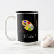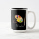 Moderne Kunstpalette mit Malpinsel und Text auf schwarzer Tasse. Text kann personalisiert sein.