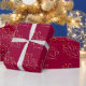 Elegantes Weihnachtspapier mit einer künstlerischen Weihnachtsbaumgrafik auf einem Maronhintergrund.