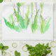 Ein Gartenthemenhandtuch mit Artischocken, mit Aquarellfarbe bemalt und mit Bleistift gezeichnet, mit Aquarellspatterflecken für Designeffekte. Einzigartige Wohngestaltung für die Hauswärmung oder für die eigene Küche.