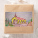 Eine Aquarellstift-Skizze und Malerei der Alto Vista Kapelle in Aruba mit Karibischem Meer und verschiedenen Kakteen, Felsen und dornigen Sträuchern.