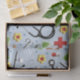 Kreatives Geschenkpapier oder Party-Dekor mit künstlerischen Pflegeprodukten und Blume.