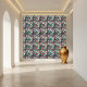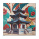 Die schicke und kulturell reiche Kachel im Chinoiserie-Stil präsentiert eine majestätische asiatische Pagode mit aufwändigen Details aus blauem Porzellan und üppigen Blumenelementen. Ein wunderschöner Akzent für traditionelle, boho oder Vintage Räume.