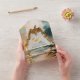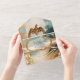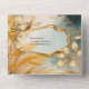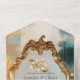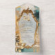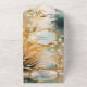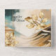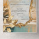 Ein künstlerisches nahtloses Design aus goldenen Wellen, die in Blues, Türkis und Weißschaum glitzern und an der Küste abstürzen, in Ölen gemalt, wird mit einer wunderschönen Aquarellfarbe aus japanisch inspiriert aquatischen Pflanze in Orange und Braun, die im Wasser reflektieren, gepaart. mit goldenen Blätter und einem Rahmen für personalisierte Hochzeitseinladungen.