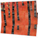 Ein modernes Landschaftsbild eines Birken- oder Aspenwaldes in kräftigen Farbtönen von Rot, Orange und Gelb.