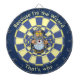 Blaues Dartboard mit benutzerdefiniertem Text. Alter Zauberer mit blauem Kap, der Kristallzauberkugel anschaut.
