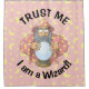 Alter Zauberer mit rosa Umhang, der Kristallzauberkugel betrachtet.