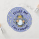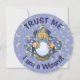 Alter Zauberer mit blauem Kap, der Kristallzauberkugel anschaut.