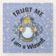 Alter Zauberer mit blauem Kap, der Kristallzauberkugel anschaut.