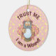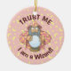 Alter Zauberer mit rosa Umhang, der Kristallzauberkugel betrachtet.