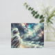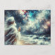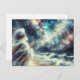 Das Bild zeigt eine Figur stehend mit einem ausgestreckten Arm vor einem lebendigen und farbenfrohen kosmischen Hintergrund, der einem Sternnebel ähnelt. Die Figur scheint ein fließendes Gewand zu tragen, das einen Eindruck von Großzügigkeit oder Weltanschauung vermittelt. Die kosmische Szene ist voll von Blau, Orange und Weiß, was auf die Weite und Schönheit des Raumes hindeutet.