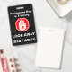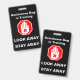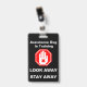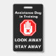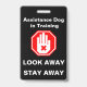 Assistenzhund in der Trainingsplattform, mit einem Stopp/No-Touch-Zeiger und "SEHEN SIE SICH WEGEN" BLEIBE