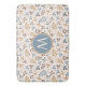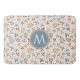 Illustratives Oberflächenmuster-Design von verschiedenen Blatt-Silhouetten in Blues, Braun und Gold auf einem cremefarbenen Hintergrund mit anfänglichem Zentrum zu personalisieren.
