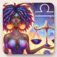 Ai Art zeigt eine wunderschöne afroamerikanische Frau mit bunten lila Dreadlocks, die eine Waage mit einem Libra-Symbol darüber halten.