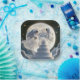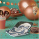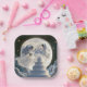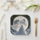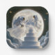 Zwei Astronauten, einer in einem Hochzeitskleid, schwimmen in der Nähe eines großen gestuften Kuchens mit Vollmond als Hintergrund