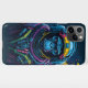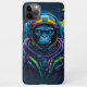Apple phone case featuring an illustration of a monkey wearing a spacesuit and wearing headphones, neon style, black light, made by AI