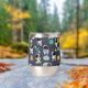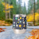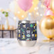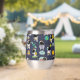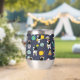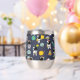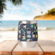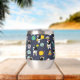 Eine Grafik des Astronauten-Cliparts, Outer Space: Astronaut, der Ballon als Planet hält, eine Rakete, Sterne, UFO-Symbol, Raumsatellitensymbol, Saturn Planet, Raumschiff und andere. Auf Oxford Blue (marineblau) Hintergrund.