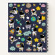 Eine Grafik des Astronauten-Cliparts, Outer Space: Astronaut, der Ballon als Planet hält, eine Rakete, Sterne, UFO-Symbol, Raumsatellitensymbol, Saturn Planet, Raumschiff und andere. Auf Oxford Blue (marineblau) Hintergrund.