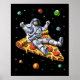 Dieses komische kosmische Design zeigt einen Raumastronauten, der auf einem Pizzaschnitt reitet.