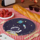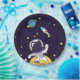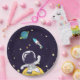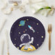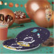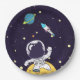Papierservietten mit dunkelblauem Hintergrund mit gelben Sternen verstreut. Obergeschichtet ist eine Abbildung eines Raumfahrers, der einen Anzug des Astronauten trägt, der über dem Mond schweben lässt. Hallo, wenn er den Weltraum erforscht. In der Ferne ist ein Planet mit Ringen und einem Raketenschiff, das in den Weltraum abfliegt.