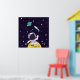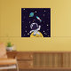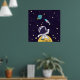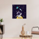Ein Poster mit dunkelblauem Hintergrund mit gelben Sternen, die verstreut sind. Obergeschichtet ist eine Abbildung eines Raumfahrers, der einen Anzug des Astronauten trägt, der über dem Mond schweben lässt. In der Ferne ist ein Planet mit Ringen und einem Raketenschiff, das in den Himmel fliegt und nach neuen Welten sucht, die es zu erforschen gilt.