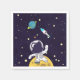 Papierservietten mit dunkelblauem Hintergrund mit gelben Sternen verstreut. Obergeschichtet ist eine Abbildung eines Raumfahrers, der einen Anzug des Astronauten trägt, der über dem Mond schweben lässt. Hallo, wenn er den Weltraum erforscht. In der Ferne ist ein Planet mit Ringen und einem Raketenschiff, das in den Weltraum abfliegt.