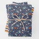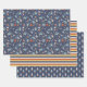 Papierblätter aus glattem Papier mit drei aufeinander abgestimmten Mustern: faulende Astronauten, die im Weltraum zwischen Planeten herumschwebend, Sternschuss schießen und Raumschiffe; Streifen in blau, rot, gelb und cremefarben; und ein Raumraketenmuster auf dunkelblauem Hintergrund. Ideal für Kinder zum Geburtstag und für Babyduschen.