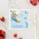 This adorable baby shower napkin features a whimsical teddy bear in his space rocket coming in for a landing on earth. In the sky are various planets and stars and even an asteroid. A telescope is in the corner. An easy to use template is provided for you to put in the Mother to be's name and the shower date. There are lots of other coordinating items in the collection so be sure to take a look through it.
