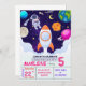 Astronaut, Außenraum, Planets Birthday Einladung wird vorgestellt, eine Rakete mit einem Astronauten mit einem Kuchen und eine Menge Planeten, Asteroiden, Sternschießen, Mond und am unteren modernen Text verwendet, um die Eleganz dieser Einladung zu erhöhen.