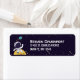 Adressetiketten mit dunkelblauem Hintergrund mit gelben Sternen verstreut. Obergeschichtet ist eine Abbildung eines Raumfahrers, der einen Anzug des Astronauten trägt, der über dem Mond schweben lässt. In der Ferne ist ein Planet mit Ringen.