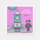 Space Geburtstagsparty Servietten für Kinder Geburtstagsfeier. Eine bequeme und personalisierbare Geburtstagserviette mit Happy Geburtstagstext, Kindername und Altersnummer auf der Rakete. Geburtstagservietten mit Astronautenmädchen und ihrem Raketenschiff auf dem Mond oder auf jedem anderen Planeten. Das Mädchen im lila Astronauten-Anzug und ihre türkisfarbene Rakete mit der Altersnummer darauf sind im All. Der Astronaut von Mädchen ist großartig für die Geburtstagsfeier von Mädchen.