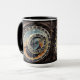 Farbphotographie einer historischen, mittelalterlichen Sehenswürdigkeit, eine alte astronomische Uhr in Prag in Europa mit den Blauen, Orange und Braunen, Astrologiezeichen und den römischen Ziffern. Fotografie in den Schwarz-Blues und -orangen.