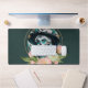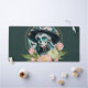 Atemberaubende Frau mit einem atemberaubenden Zuckerschädel. Die hellen Farben und die faszinierenden Muster erzählen Geschichten von Leben und Tod und geben ihr einen fröhlichen, aber respektvollen Look, der perfekt für Día de los Muertos ist. Ihr langes, fließendes Haar leuchtet ein brillantes Türkis, das wie ein farbiger Wasserfall über ihre Schultern fließt. Es fängt das Licht an und verbessert die festliche Stimmung des Designs. Der Hintergrund leuchtet in tiefer Blues und Grüntönen, die an einen Nachthimmel erinnern, während zarte rosa und weiße Blume um sie herum tanzen. Diese Blumenakzente tragen nicht nur zur Farbe bei, sondern symbolisieren auch die Liebe und Erinnerung der Verstorbenen.