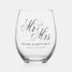 Atemberaubend personalisierte Mr. and Mrs. wedding Stemless Wine Glass. Maßgeschneiderte Brillen für alkoholische Getränke, Säfte, Smoothies, Kompost und vieles mehr. Klassisches Trinkglas personalisiert mit Namen von Braut und Bräutigam. Einzigartige Trinkgläser für extravagante Hochzeitsfeiern im Sommer und zu anderen Jahreszeiten. Ändern Sie die Menge, um den billigen Schüttgutpreis zu erhalten. Stilvolle Schrift-Typografie-Vorlage. Teil des passenden Designs.