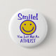 Setzen Sie ein menschliches Gesicht auf Atheismus mit einem hellen gelben Gesicht ein, das in Blau mit blauen Buchstaben umrissen wird, das sagt: "Lächeln! Sie trafen gerade einen ATHEISTEN."