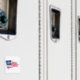 Stilisiertes Bild der amerikanischen Flagge mit dem Atheisten Atom-Symbol im blauen Feld, wo die Sterne sein würden.