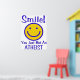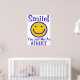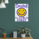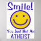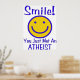 Lege ein menschliches Gesicht auf den Atheismus mit einem hellgelben, blau umrissenen Gesicht mit blauen Buchstaben, die sagen: "Lächle! Sie haben gerade einen ATHEIST getroffen."