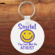 Lege ein menschliches Gesicht auf den Atheismus mit einem hellgelben, blau umrissenen Gesicht mit blauen Buchstaben, die sagen: "Lächle! Sie haben gerade einen ATHEIST getroffen."