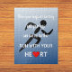 Das Design für dieses Rätsel zeigt die Silhouette eines Läufers auf blauem Hintergrund. Der Text überlagert es: "Wenn deine Lungen platzen und deine Beine nicht mehr laufen können, Lauf mit deinem Herzen". Es fängt den Moment ein, in dem deine Beine in Qualen sind, dein Körper schreit "Stopp!" aber dein Gehirn sagt "Nein! Das Rennen ist noch nicht vorbei!" Das ist der Moment, tief zu graben und von deinem Herzen zu rennen.