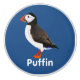 Ein digitales Bild eines atlantischen Puffins mit dem Text "Puffin" auf blauem Hintergrund. Der Atlantische Puffin (Fratercula arctica) füttre vor allem durch Tauchen im Wasser. Sie züchten sich in großen Kolonien auf Küstensteilküsten oder vor der Küste gelegenen Inseln im Nordatlantik. Puffins vergossen die farbenfrohen äußeren Teile ihrer Rechnungen nach der Brutzeit, und verließ einen kleineren und langweiligen Schnabel. Ihre kurzen Flügel sind für das Schwimmen mit einer Flugtechnik unter Wasser angepasst. In der Luft schlagen sie schnell (bis zu 400 Mal pro Minute) bei einem schnellen Flug ihre Flügel und fliegen oft tief über der Meeresoberfläche.